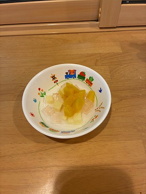 今日のメニューは牛乳と紅白寒天ポンチです。