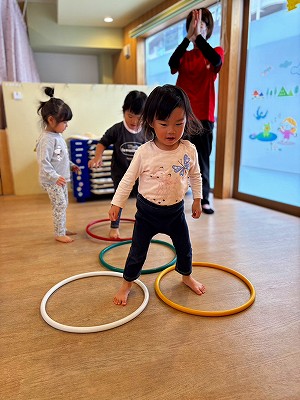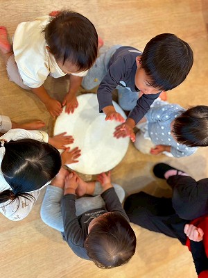 大きなタンバリンをみんなでたたいたり、忍者ごっこやフープを使った遊びもありました😆
