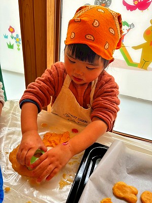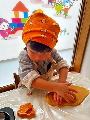 型抜きを楽しんだあと、次は手でお団子のように丸めるお友だちもいて、「お団子の形だとしっかり焼けないよ」と伝えるとそれをぺちゃん!と平らにしてオリジナルの丸い形のクッキーも作りました!