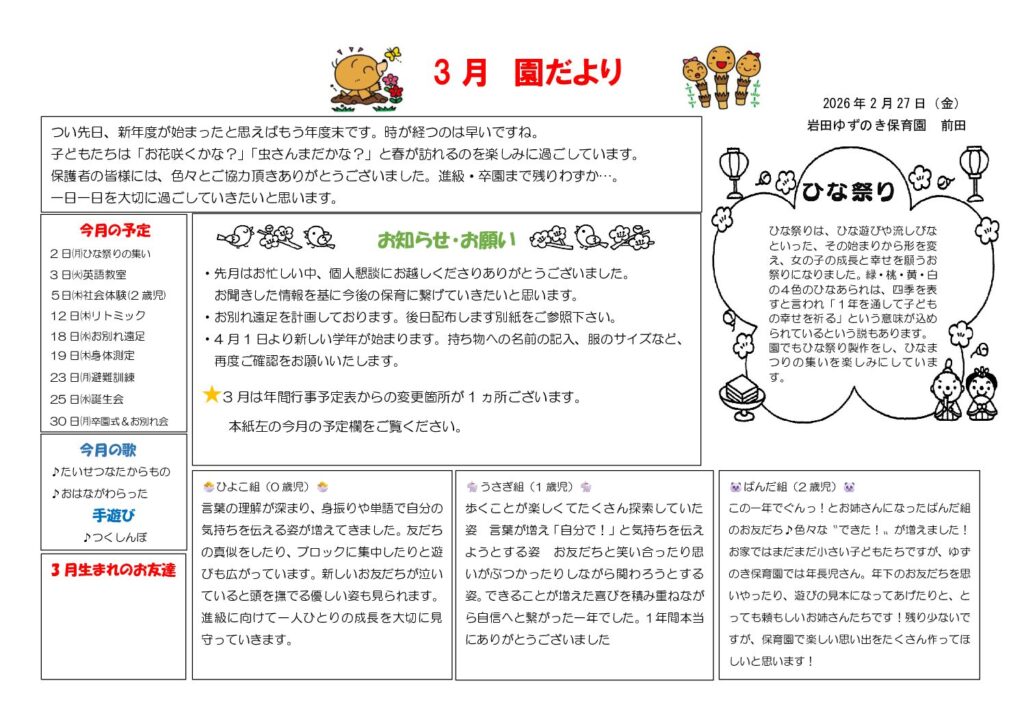 こんにちは!3月の園だよりです☆